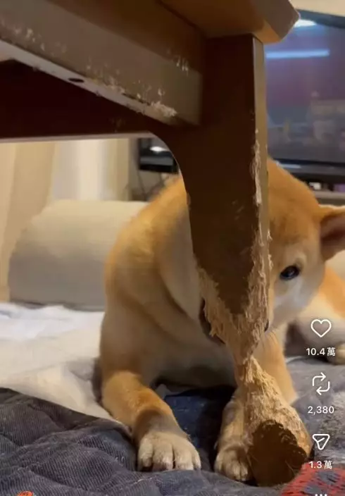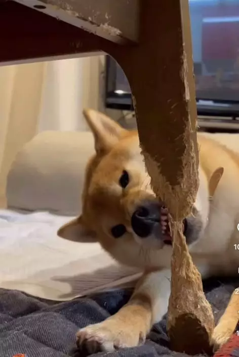 柴犬將茶几枱腳當潔齒骨每日啃咬,半年終「完工」將枱腳咬斷。IG圖片