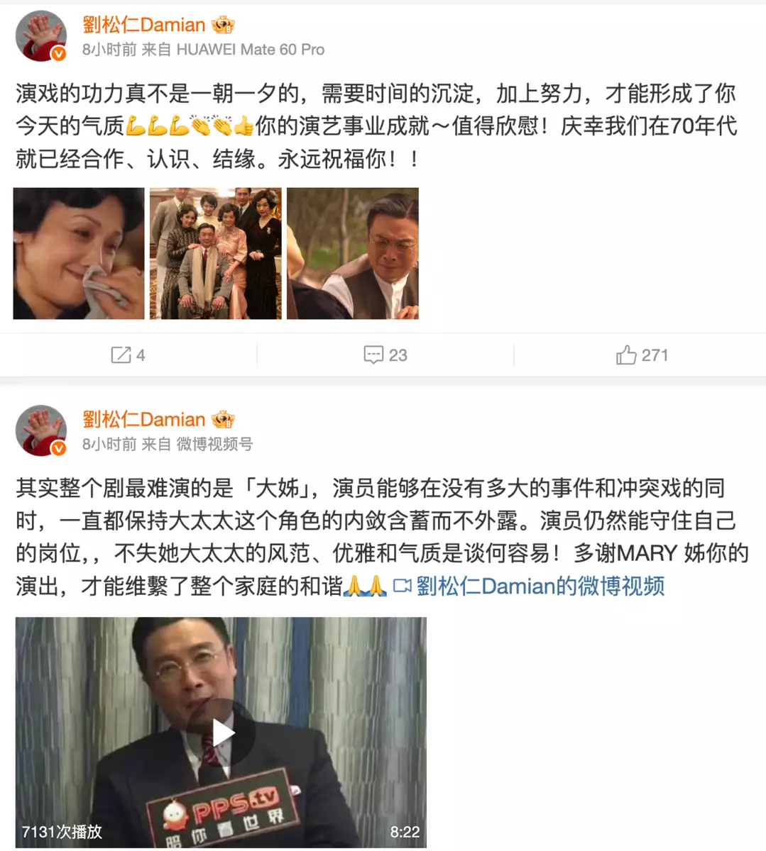 劉松仁更特別大讚「大太太」韓馬利的演得出色,「演戲的功力真不是一朝一夕的,需要時間的沉澱,加上努力,才能形成了你今天的氣質,你的演藝事業成就~值得欣慰!慶幸我們在70年代就已經合作、認識、結緣。永遠祝福你!」