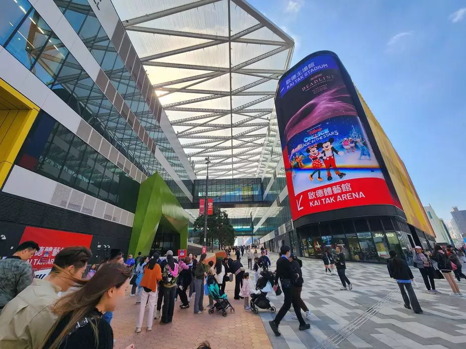 啟德車站廣場與渡行徑上高掛的BLACKPINK旗海隨風飄揚