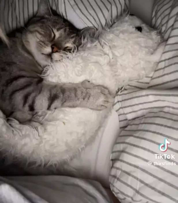 日前,國外一名22歲女飼主席爾莎(Thirsa Scheening)於TikTok上分享一段溫馨趣事指,某天晚上醒來時,赫然發現身旁多了一名毛茸茸的「不速之客」。鏡頭一轉,原來是她飼養的虎斑貓 Nobu 正依偎著一隻泰迪熊公仔熟睡,安然入睡的模樣猶如抱著公仔的小嬰兒,畫面可愛至極。