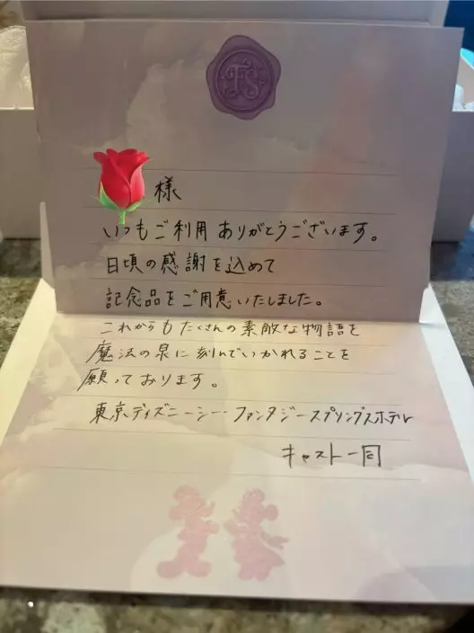 日前,日本一名帖主「コウ」於社交平台X上分享入住東京迪士尼海洋「夢幻泉鄉大酒店」的難忘經歷。據悉,這已是他第10次入住該酒店。他表示,當日進入預訂房間時,赫然看見桌上放有一個印有酒店標誌的紀念皮革收納包,以及一封由酒店全體職員手寫的感謝信作為特別心意禮物,信中寫道:「感謝您的長期支持,特別準備這份紀念品以表心意。希望您未來也能在魔法之泉中,留下更多美好的故事」。