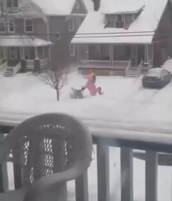熱心男為方便鄰里出入著「彩虹小馬」服裝外出清理道路積雪。影片截圖