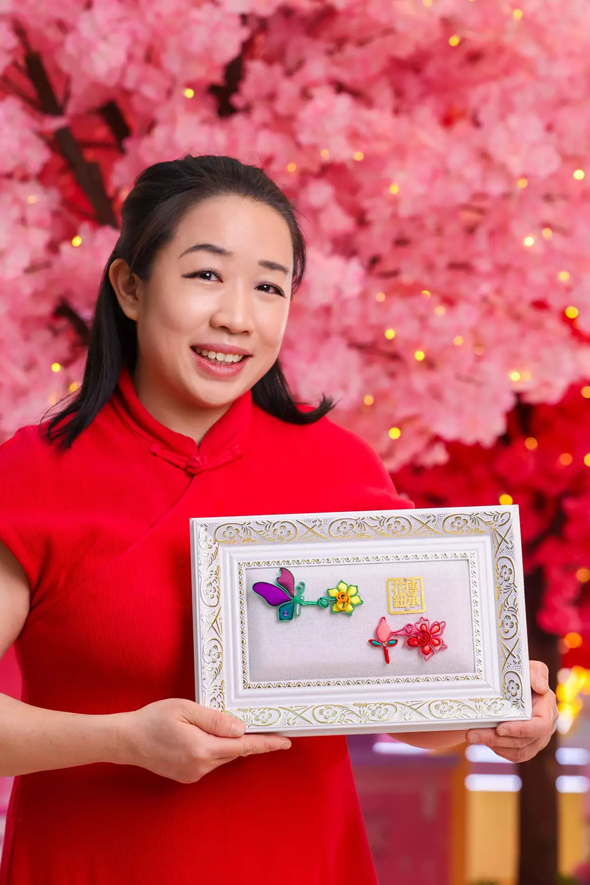 商場特別聯乘非物質文化遺產花鈕工藝傳承人麥琬思(Mercy Mak)以彩蝶、水仙及桃花作主題,獨家設計出「花飛蝶舞」花鈕工藝胸針套裝,一套兩款為「水仙舞蝶」及「桃花吐蕊」。每款設計精緻典雅,蘊含吉祥寓意,極具收藏價值。而利是封更融入兩款花鈕工藝胸針心思設計,配以氣派感滿溢的燙金及浮雕效果,打造立體層感。