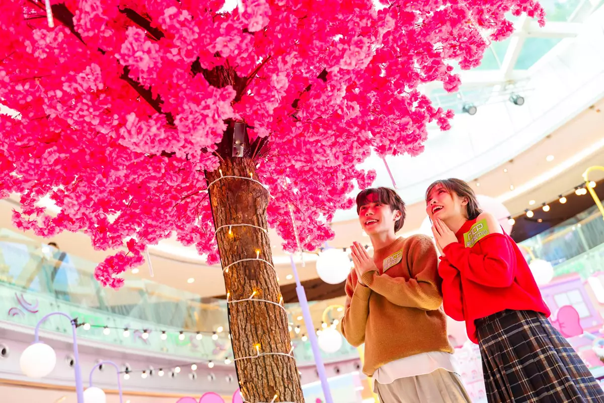 4米高的祈願櫻花樹,燈串猶如星光灑落樹冠,粉嫩花海從樹梢一路蔓延至腳邊,將整個場景瞬間加上一層夢幻濾鏡,無論抬頭仰望或站在櫻花樹前合照,都能拍出仿如韓劇中的浪漫唯美照!