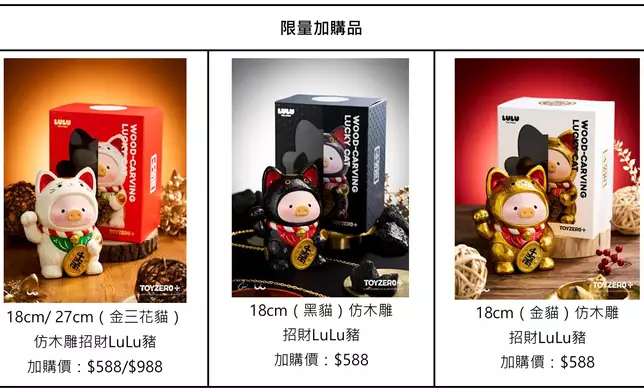 而由1月31日起,凡購買任何罐頭豬LuLu產品滿$200,即可以 $988 加購一隻「罐頭豬LuLu——27cm仿木雕招財Lu (金三花貓)」一隻。所有款式數量有限,售完即止。