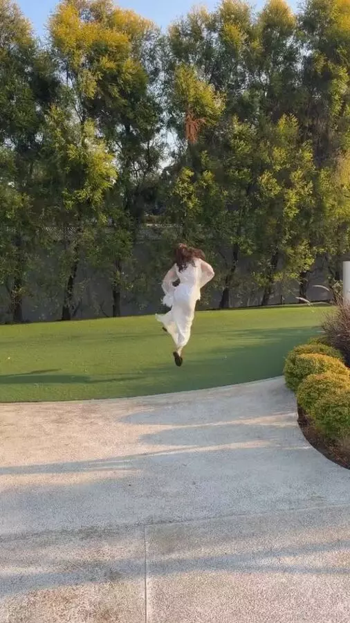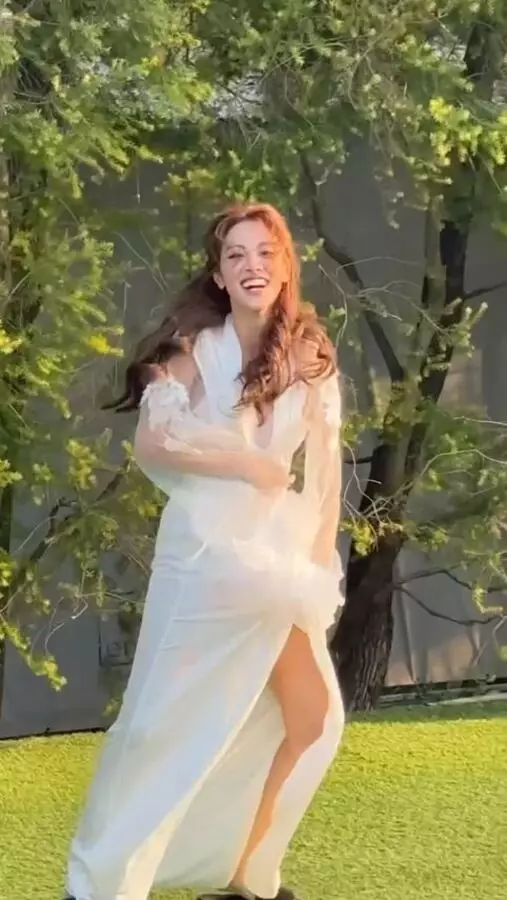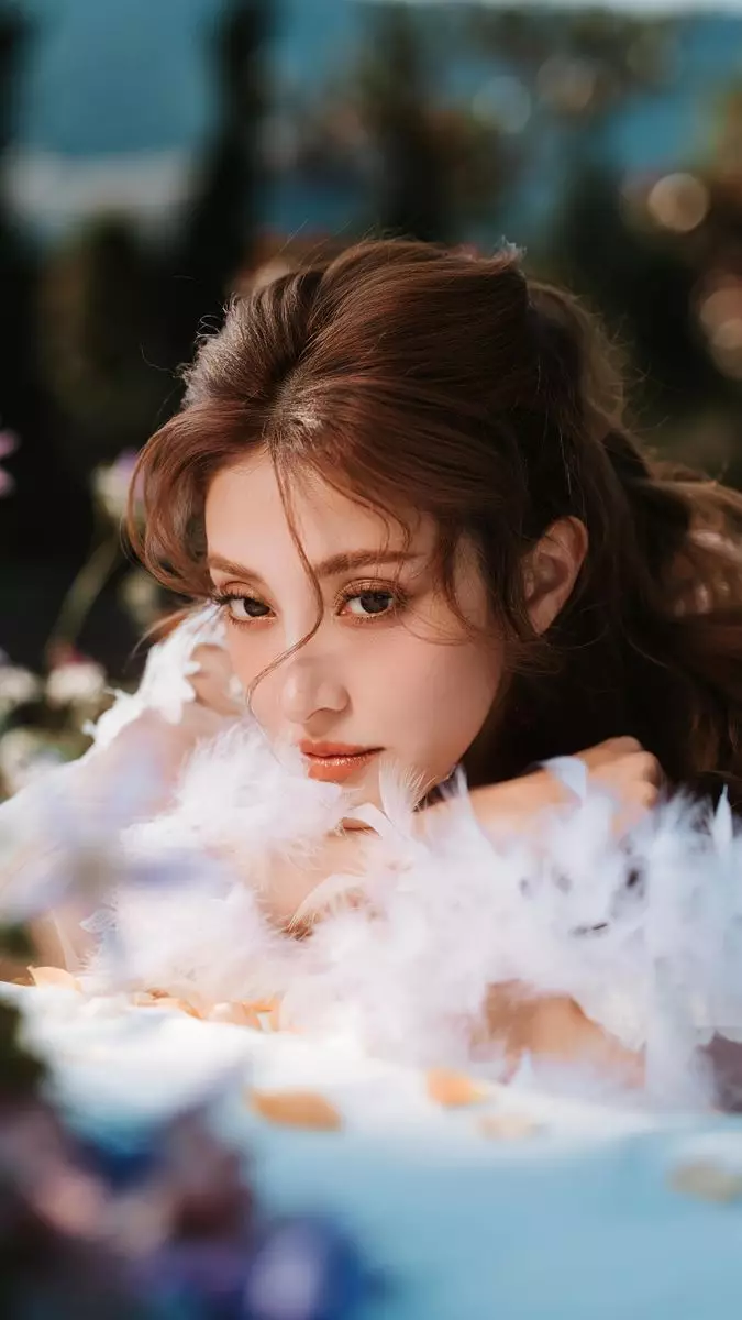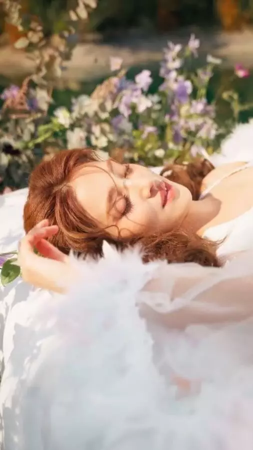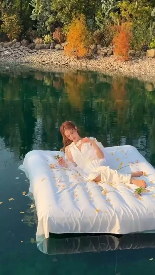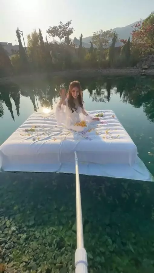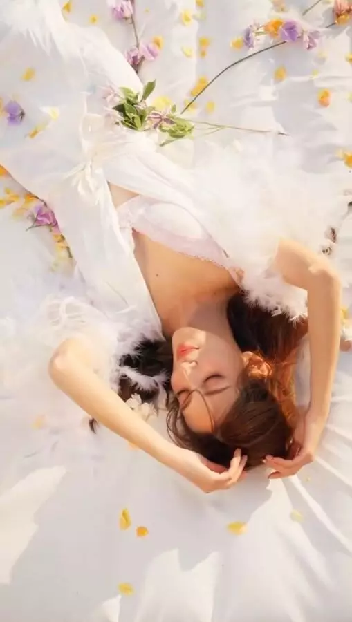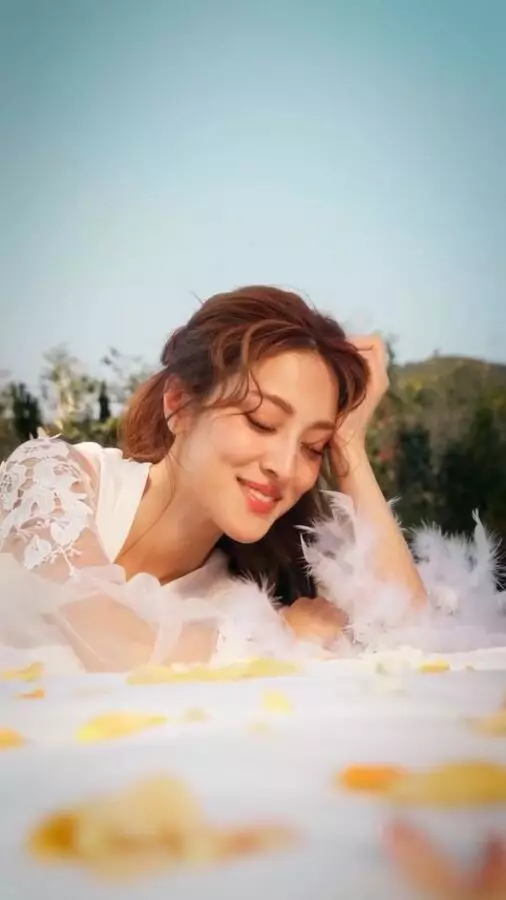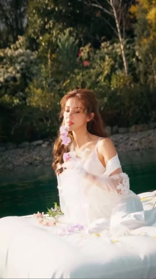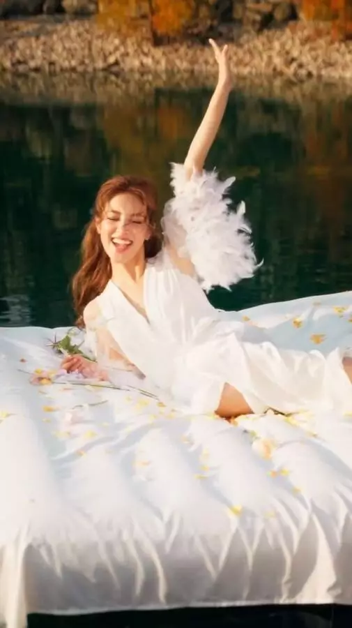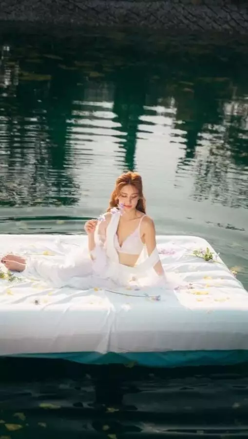 之後,陳凱琳在工作人員協助下爬上道具床,道具床再被推到水池中央,她躺在床上擺出多誘人pose,她更解開睡袍露出裏面的白色喱士胸圍,大騷完美Body,加上身旁的鮮花點綴,性感又唯美!拍攝完成後,陳凱琳回到岸上即開心狂奔,相當可愛!