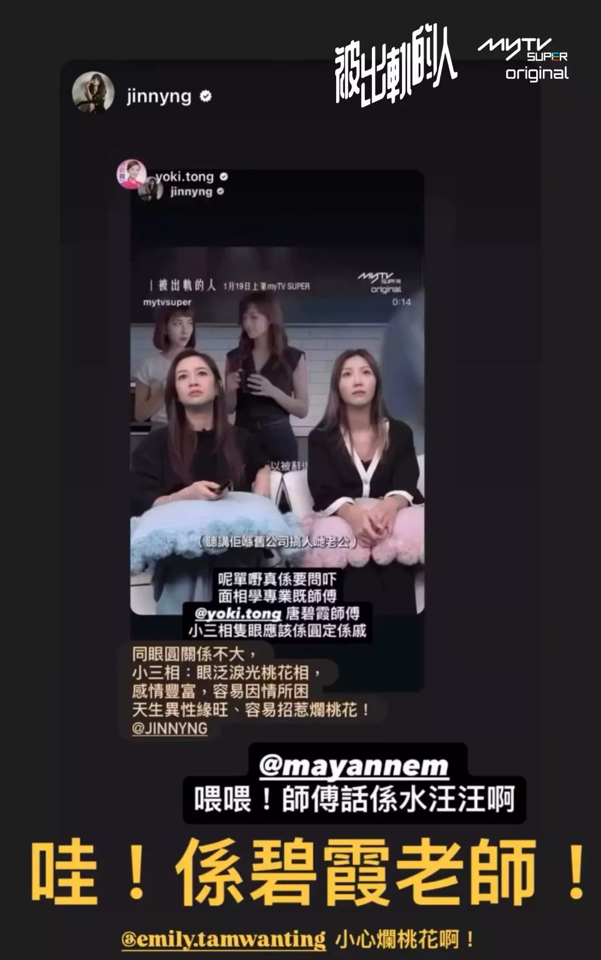 myTV SUPER於社交平台公開多位藝人試看的真實反應。麥美恩(Mayanne)觀看預告後一度驚呼:「鹹片可以喺電視播?!」吳若希(Jinny)則代入感極強,直言若現實中遭遇女主角 Nicole 的境況,希望身邊人能直接告之實話,更笑言最好一併提供證據,方便自己爭取撫養權。Jinny 隨後更緊貼劇情,於 Instagram 上請教唐碧霞師傅「小三相」特徵,引發討論。Mayanne與Jinny特別留意到A.I.女演員穿著比堅尼時,連腰間微小的「贅肉」也完美還原,大讚製作團隊極其注重細節,令畫面真實感倍增。