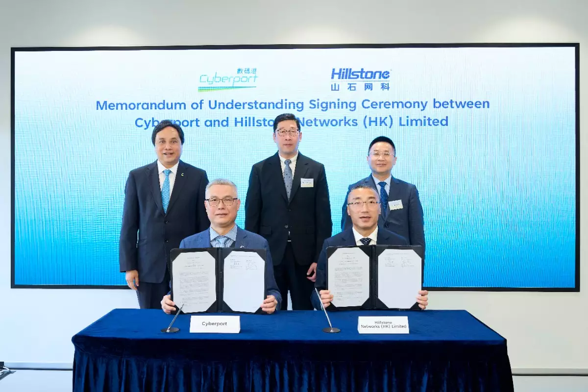 合作備忘錄簽署儀式由數字政策辦公室副數字政策專員(數字基建)張宜偉、數碼港主席陳細明及山石網科董事長兼首席執行官葉海強出席見證,並由數碼港行政總裁鄭松岩博士與山石網科副總裁、國際事業群負責人趙京璽簽署。