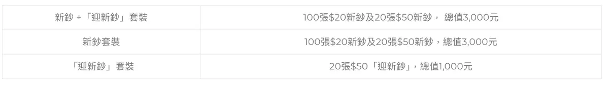 每位客戶只可於每天預約一個時段,並換領一套新鈔或迎新鈔套裝。新鈔每套總價值3,000元,面額為100張20元及20張50元新鈔。