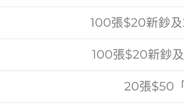 - 注意事項每份新鈔套裝總值4000元,包括50張20元新鈔、20張50元新鈔及20張100元新鈔。