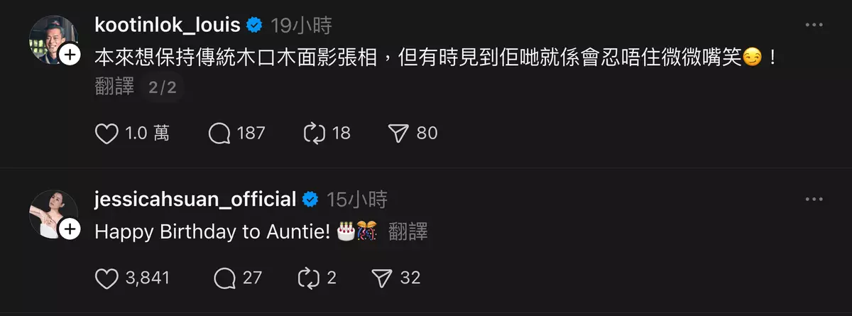 相中,古天樂搭着父母的膊頭,並一棄以木口木面的表情,罕有露出微笑,他自己亦留言道:「本來想保持傳統木口木面影張相,但有時見到佢哋就係會忍唔住微微嘴笑!」相當溫馨!而好拍檔宣萱都留言為古媽媽慶生,「Happy Birthday to Auntie! 」