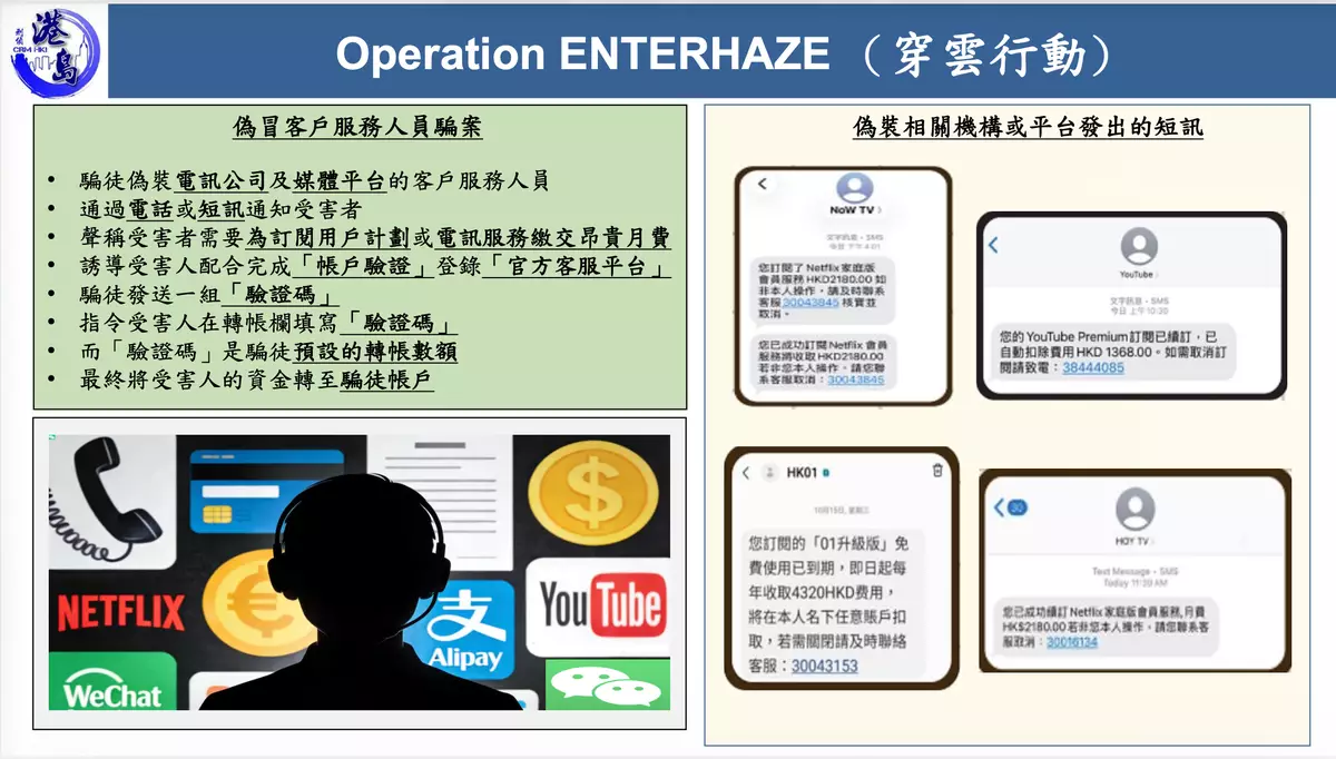 警方又指,騙徒手法層出不窮,最近除了常見的偽冒官員和投資騙案之外,還有不少市民陷入了各類型的「偽冒客戶服務人員騙案」。「偽冒客戶服務人員騙案」中,騙徒會偽裝成電訊公司及媒體平台等的客戶服務人員,通過電話或短訊通知受害者,聲稱市民已訂閱用戶計劃或收費電訊服務,而需要繳交昂貴月費。事實上,受害市民從未主動登記過任何相關訂閱服務或年費計劃,面對突如其來的「收費通知」,受害人變得緊張,騙徒也因此有機可乘。
