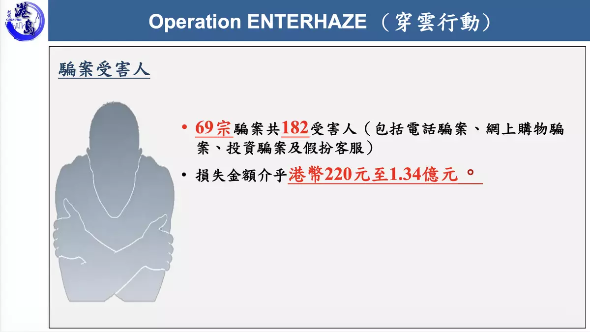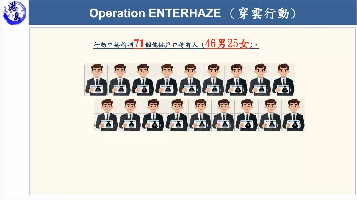 為應對騙案上升趨勢,港島總區刑事部聯同港島總區轄下四個警區的所有刑事單位,於1月12日至1月26日期間,展開為期15日、代號「穿雲行動」的反詐騙及反洗黑錢行動。 此次行動共拘捕71人,角色為傀儡戶口持有人,總共包括46男25女,年齡介乎14至65歲,報稱的職業包括學生、家庭主婦、地盤工人及保安等。他們涉嫌干犯「洗黑錢」罪行,共涉及69宗騙案及相關洗黑錢案件。 這些案件牽涉182名受害人。受害人年齡介乎18至68歲,損失金額由220元至1億3千4百萬元不等,累計損失超過2億1千4百萬。受害人涵蓋不同社會背景,其中亦包括部分高收入及高學歷人士。職業分布方面,目前已知涉及文員、律師、及牙醫等多種行業。