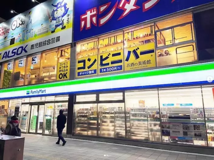 據日媒報導,位於JR鹿兒島中央站附近的全家便利商店「鹿兒島中央郵便局前店」外觀看起來像一般的便利店,但在夜晚,二樓卻變身成為一家酒吧,由擁有一百多間分店的連鎖品牌「お酒の美術館」進駐,是鹿兒島唯一的一家店。