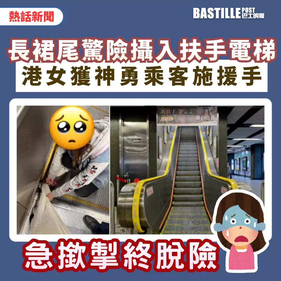 日前一名女網友在社交平台分享自己在港鐵站搭乘扶手電梯時的驚險經歷,她指長裙尾突然攝入電梯邊緣,即使「用盡奶力」也無法扯出 ,驚險一刻,幸得熱心乘客即時按下緊急煞停掣並通知職員協助,而最終需剪走被夾住的裙尾脫險。