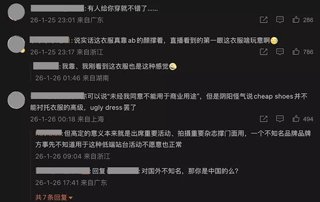 一句「cheap shoes」隨即觸動內地網民神經,事件迅速發酵。有人替Angelababy抱不平,認為穿搭及合作安排應由造型師及經理人公司負責,藝人未必知情;亦有人反擊設計師態度「陰陽怪氣」,留言指:「你可以說未經授權,但不需要踩國產」、「ugly dress罷了」、「有人肯穿你件衫已經不錯」。