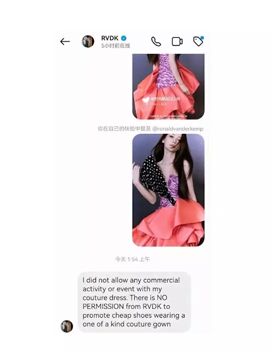 不過,當有網民將Angelababy直播推廣波鞋的片段轉發給設計師後,他即公開表態,明言從未批准任何商業用途,更直言:「我沒有允許任何人穿著我的高級訂造服進行商業活動,更沒有授權用這件獨一無二的訂造禮服去推廣廉價鞋(cheap shoes)。」