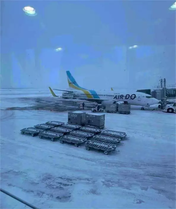 暴雪籠罩下,AIR DO等多架航機被迫停飛,地勤設備與停機坪積雪嚴重,直接癱瘓了機場運作。