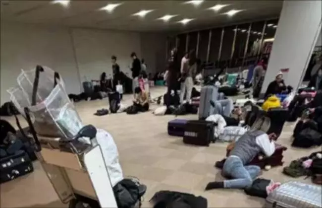 7000人滯留機場別無選擇,只能裹着大衣直接躺在大堂地板過夜,昔日整潔的機場瞬間淪為「難民營」。