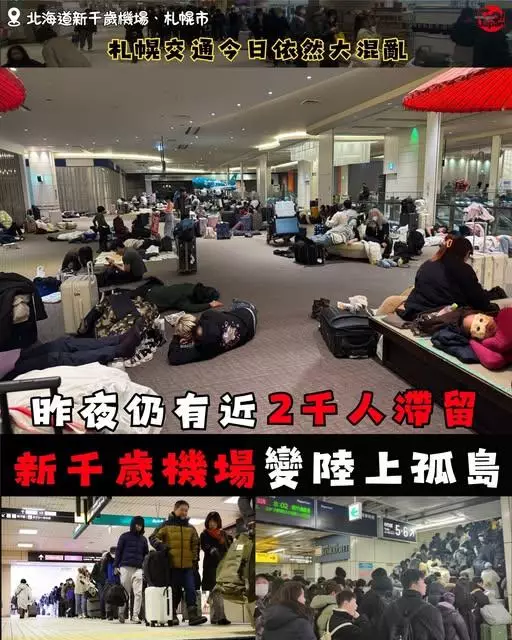 網絡上流傳的畫面相當「精彩」:數千人密密麻麻地躺在機場大堂的地板上,有的搶到了毛毯,有的只能枕着背包蜷縮一團;機場內的Lawson便利店貨架被一掃而空,連個飯糰都買不到;的士站外排起了超過200人的長龍,而在札幌站附近的地下通道,同樣有約340人無家可歸,只能席地而睡。