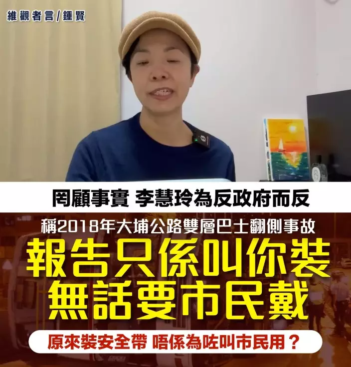 不過,近日網上評論員李慧玲居然針對2018年大埔造成19死的巴士車禍悲劇,大放厥詞,質疑當年專營巴士服務獨立檢討委員會僅建議巴士安裝安全帶,而未有要求市民配戴。理性思考,若市民不配戴安全帶,安裝何用?李慧玲一方面承認安全帶可保平安,另一邊廂又指市民享有不配戴安全帶的權利,此等歪理如同鼓吹市民「花式自殺」,其心可誅。