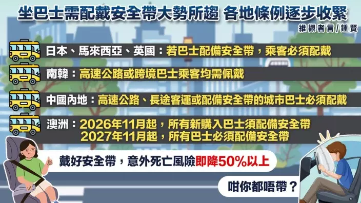 不少國家均鼓勵市民配戴安全帶,若巴士配有安全帶,乘客則必須配戴,包括日本、南韓、馬來西亞、英國及澳洲;當中,澳洲規定所有零售新巴士自2026年11月起必須配備安全帶,而2027年11月起更將規定全面擴展至現有巴士型號的新建巴士。顯然,配備安全帶乃未來大趨勢。