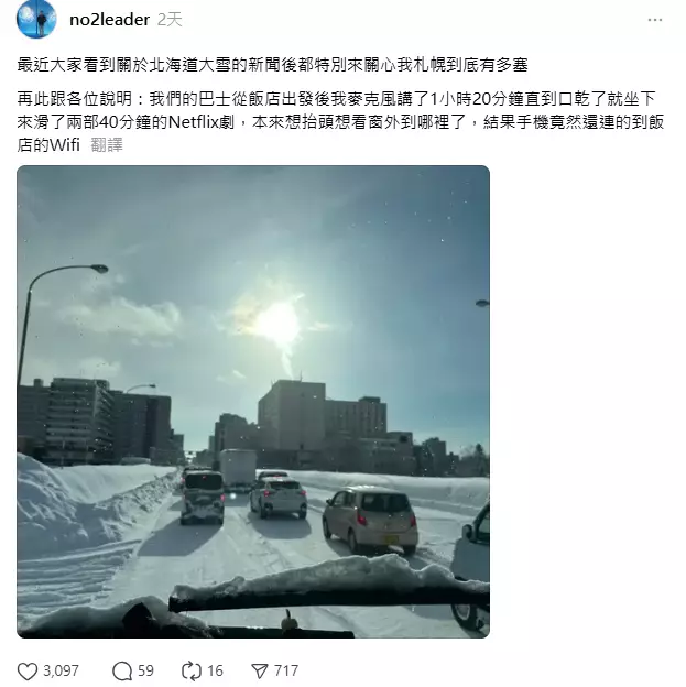 一位在北海道帶團的導遊表示,這場大雪讓他收到不少關心「札幌到底有多塞」的詢問,他便描述了26日帶團情形,指出早上帶領團員搭上巴士出發後,他滔滔不絕講了1小時20分鐘,口乾舌燥坐下休息,再看了2部40分鐘的影集,正想抬頭看看車開到哪了,才發現「手機竟然還連得到酒店的Wi-Fi」。