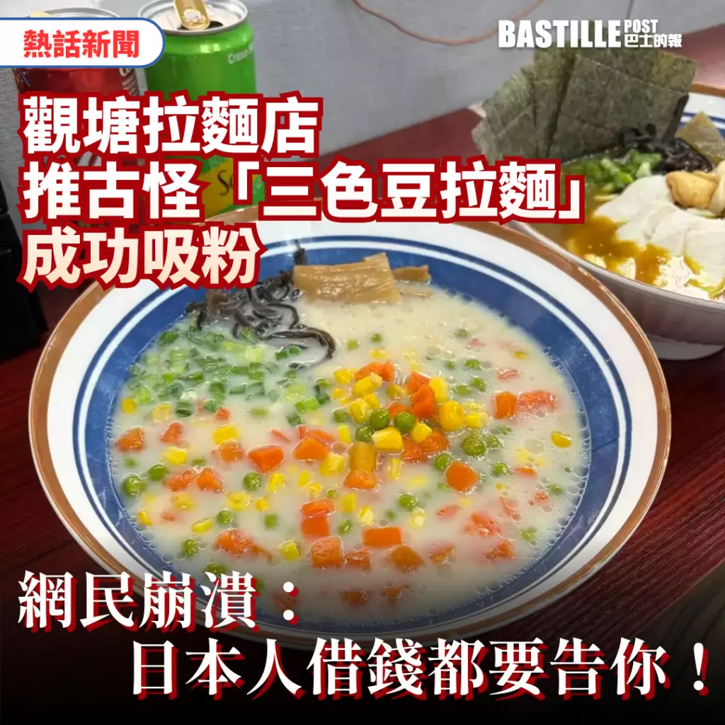 香港經濟仍處低迷,食肆結業潮仍持續,不少店家為了生存都出盡奇招,希望可以吸引大眾眼球,殺出另一條血路。日前有一間位於觀塘的拉麵店就推出了一款「三色豆拉麵」,哭笑不得的配搭,成功引起網民熱議,起了不錯的宣傳效果!