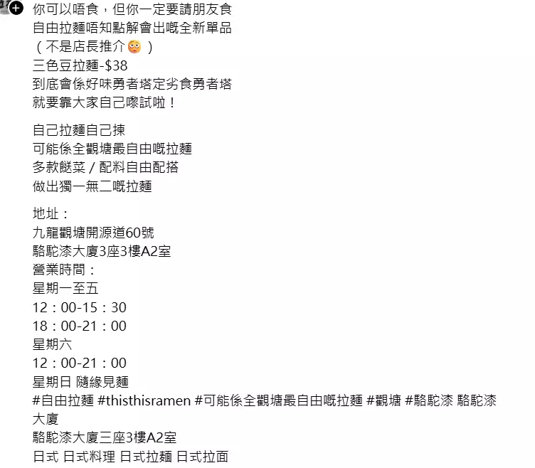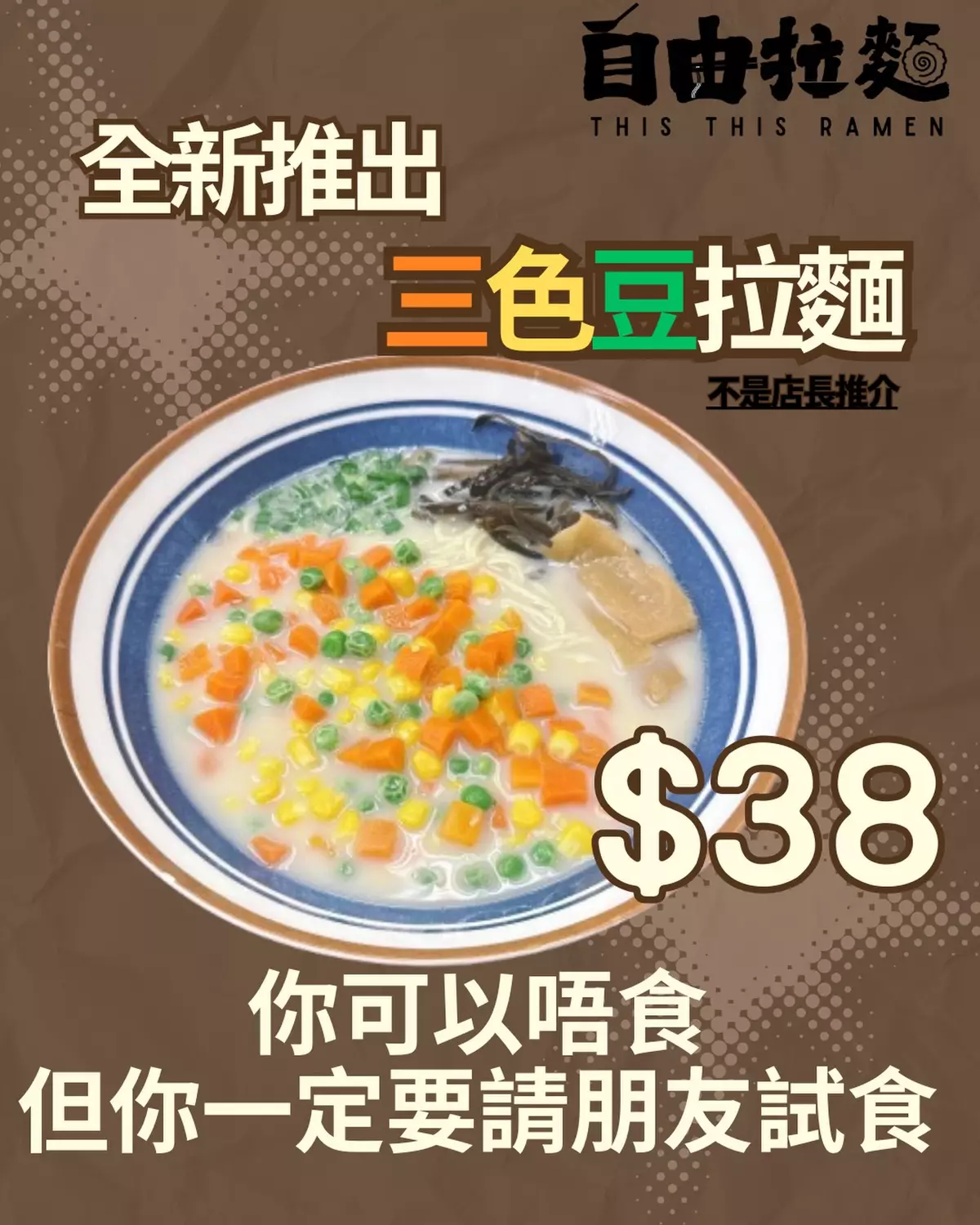 這間位於觀塘駱駝漆大廈的拉麵小店,自稱是「全觀塘最自由嘅日式拉麵」可以讓食客自由配搭配菜及湯底。日前店家在社交平台宣布推出全新產品「三色豆拉麵」。更風趣地標註「不是店長推介」售價$38元,笑稱「你可以唔食,但你一定要請朋友試食」只見圖所顯示的拉麵,面頭鋪滿了青豆、粟米粒及甘筍粒,還配有少量荀及木耳。「到底會係好味勇者塔定劣食勇者塔,就要靠大家自己嚟試啦!」