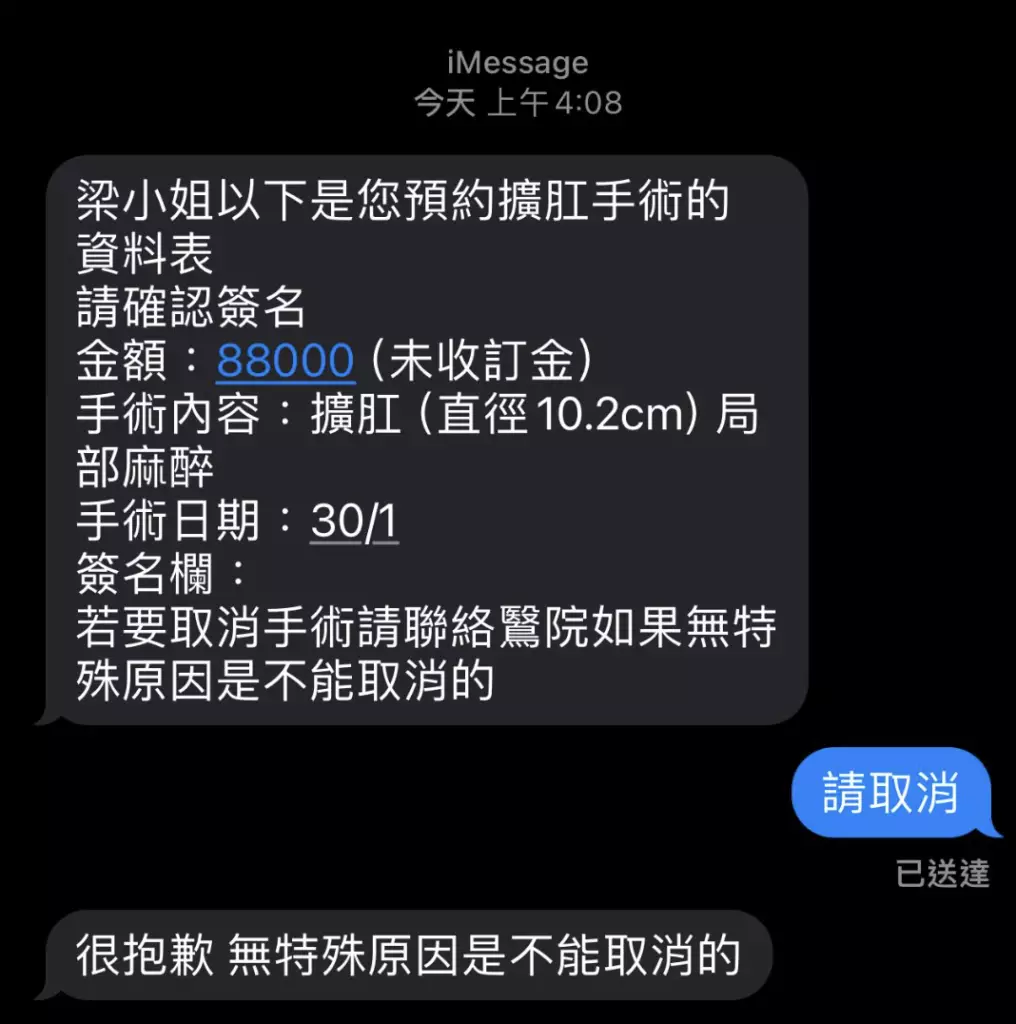 該短訊截圖在社交平台流傳。該截圖顯示,事主已預約擴肛手術,內容列明直徑要擴張至10.2厘米,金額為8.8萬元。