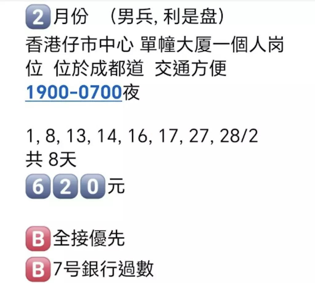 樓主在Facebook上傳一則招聘告示,內容顯示2月份需招聘人手,要求應徵者為「男兵」,並註明為「利是盤」。上班地點位於香港仔市中心,描述為「交通方便」,工作時間為「1900-0700夜」,即由晚上7時至翌日早上7時的通宵更,合共12小時。告示列出一共8天的上班日期,並標示「620元」的金額,相信為日薪,文末附註「全接優先」及「7號銀行過數」。