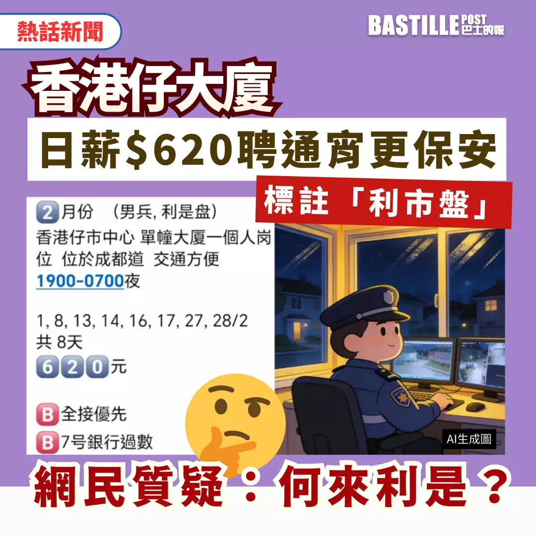近日網上流傳一則招聘告示,指香港仔成都道一單幢大廈招聘2月份保安員,工作時間為「晚七朝七」的12小時通宵更,日薪620元,並註明為「利是(利市)盤」,帖文隨即引發網民熱議。
