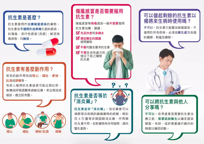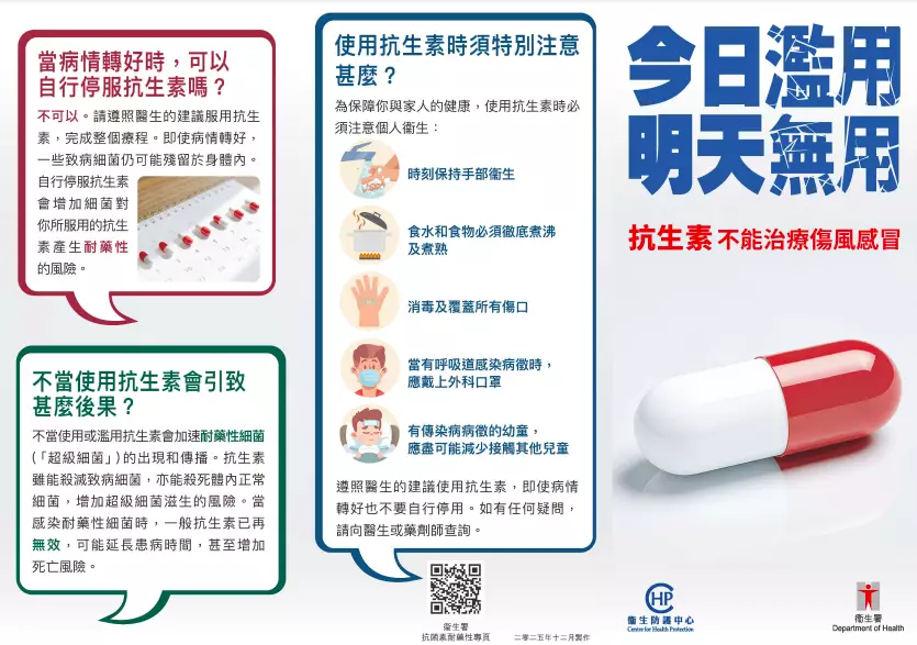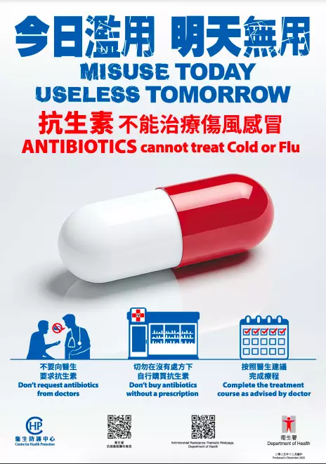 中心呼籲,市民若染上傷風、感冒或新冠病毒,應及時就醫,切勿在沒有處方下自行到藥房購買抗生素服用;不要向醫生要求抗生素。只有在醫生建議下,才服用抗生素,並須完成整個療程。即使症狀有所改善,也不應自行停用抗生素;接種季節性流感疫苗和新冠病毒疫苗,是預防二次感染細菌的有效方法,從而減少使用抗生素,避免出現抗菌素耐藥性。