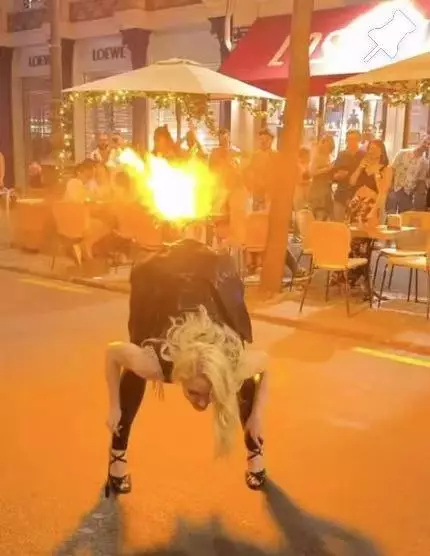 俄羅斯一名女魔術師在街頭表演吞火特技,隨後轉身從臀部噴出烈焰似「人體噴火器」,獵奇表演震驚在場觀眾。