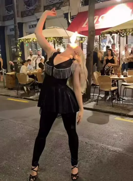 近日,安娜上載一段於街頭表演的片段,引發廣泛關注。影片可見,她手持燃燒的火把,在圍觀群眾面前熟練地表演「吞火」特技,將烈焰吞入口中。正當眾人以為表演已告一段落之際,她突然轉身背向鏡頭並微微彎腰,下一秒竟從臀部位置噴出一道熊熊烈焰,猶如「人體噴火器」般,畫面震撼又帶點獵奇,令在場觀眾驚呼連連,紛紛拿出手機拍下這一刻。