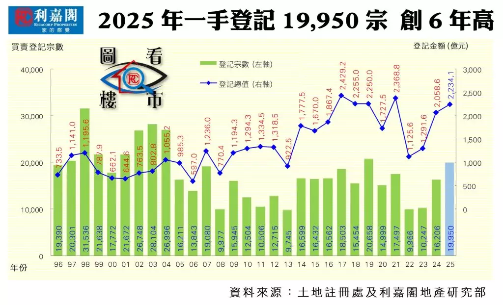 筆者整合土地註冊處數據得出,2025年全港一手私宅買賣登記量飆升至19,950宗,較2024年的16,206宗大幅躍升23%,不僅實現連續三年增長,更一舉刷新近六年高位。成交總值同步水漲船高,達2,234.06億元,按年增長9%,同樣是三年連升的勇態,並創下四年來的新高。值得注意的是,雖然成交規模擴大,但每宗一手私宅平均售價卻回落至1,119.83萬元,按年下跌11.8%,主因是去年市場以細價新盤主導。