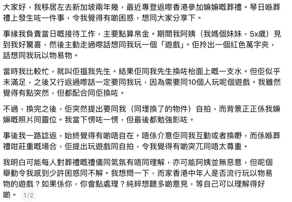 事主因正忙碌而婉拒,姨媽遂轉與事主丈夫交換一支水。其後姨媽再次走近,堅持要與事主玩遊戲,並稱「需要同10個人玩呢個遊戲」。事主為盡快打發對方,勉強同意交換。未料完成後,姨媽突然要求與事主及交換得來的物品在靈位前自拍,背景正是事主嫲嫲的遺照與靈位。