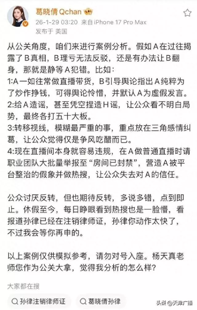 葛曉倩日前突然以虛擬案例分析形式,公開預判張雨綺團隊可能使出的四大公關手段,包括引導輿論指自己直播帶貨是「炒作掙錢」、捏造涉黃謠言、轉移視線去「三角感情糾葛」,以及聘請職業團隊惡意舉報直播間。葛曉倩擺明已作好全面應戰準備,更直接點名張雨綺昔日的金牌經理人楊天真挑機:「楊天真老師您作為公關大拿,覺得我分析的怎麼樣?」火藥味極濃。