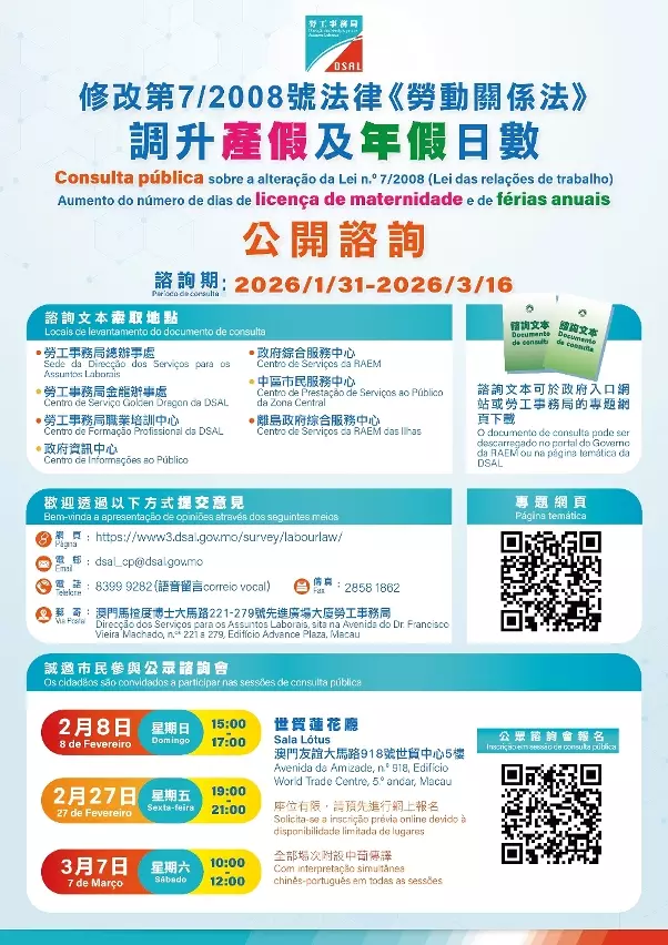 此外,勞工局將舉辦多場諮詢會,其中三場面向公眾,將分別於2月8日、27日,以及3月7日假座澳門友誼大馬路918號世貿中心五樓蓮花廳舉行。公眾諮詢會以中文講解為主,並附設中葡傳譯服務,有意出席的市民請透過前述的專題網頁預先進行網上報名。欲了解更多詳情,可瀏覽專題網頁或掃描圖文包及海報上的二維碼。