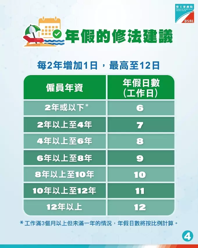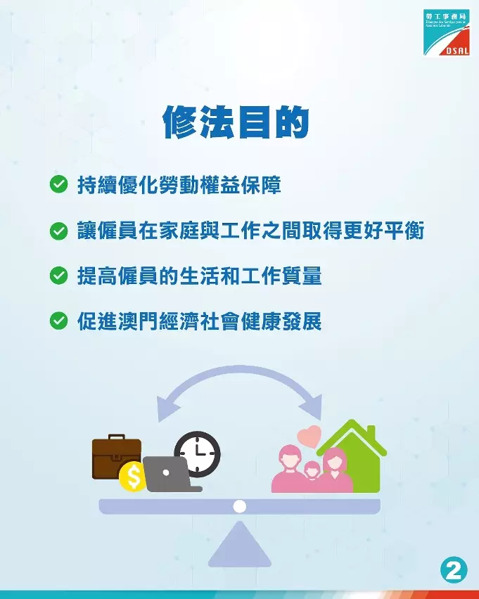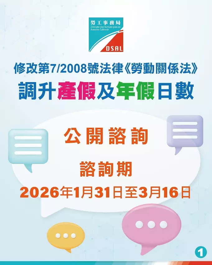 特區政府將於2026年1月31日至3月16日期間,就修改第7/2008號法律「勞動關係法」規定的產假及年假日數,展開為期45日的公開諮詢。諮詢文本建議產假調升至90日,年假則建議按年資遞增,每滿2年年假日數增加1個工作日,最多增至12個工作日,以持續優化勞動權益保障,讓僱員更好地平衡工作與家庭生活。