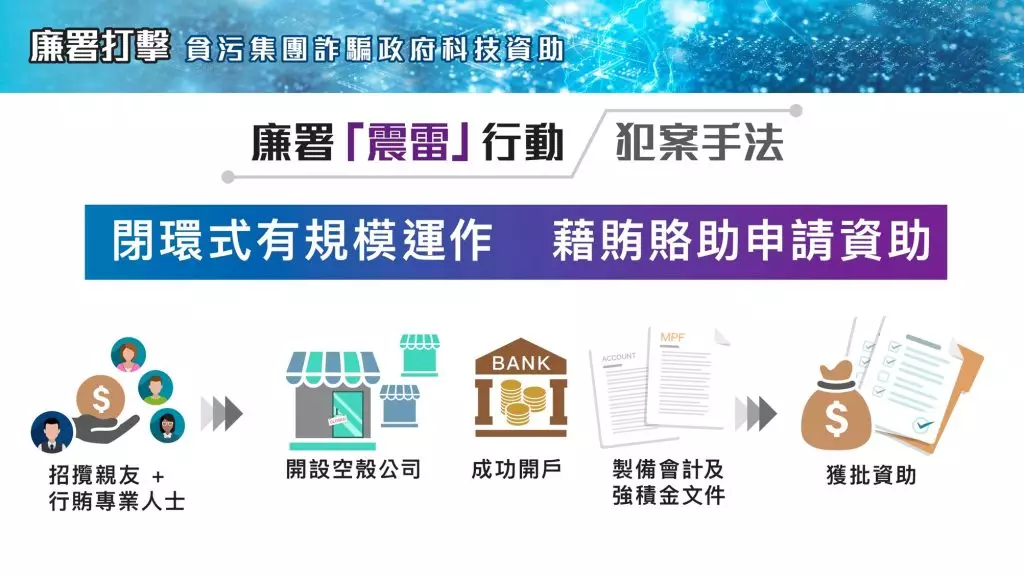 廉署搗破兩個貪污集團,涉嫌行賄、造假詐騙政府的科技資助,至今拘捕33人。創新科技及工業局回應,絕不姑息任何違法或損害公帑的行為。