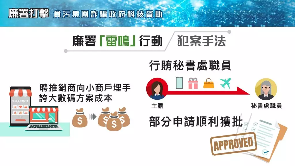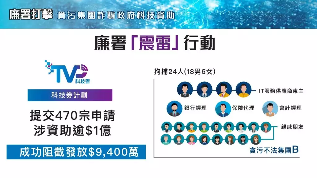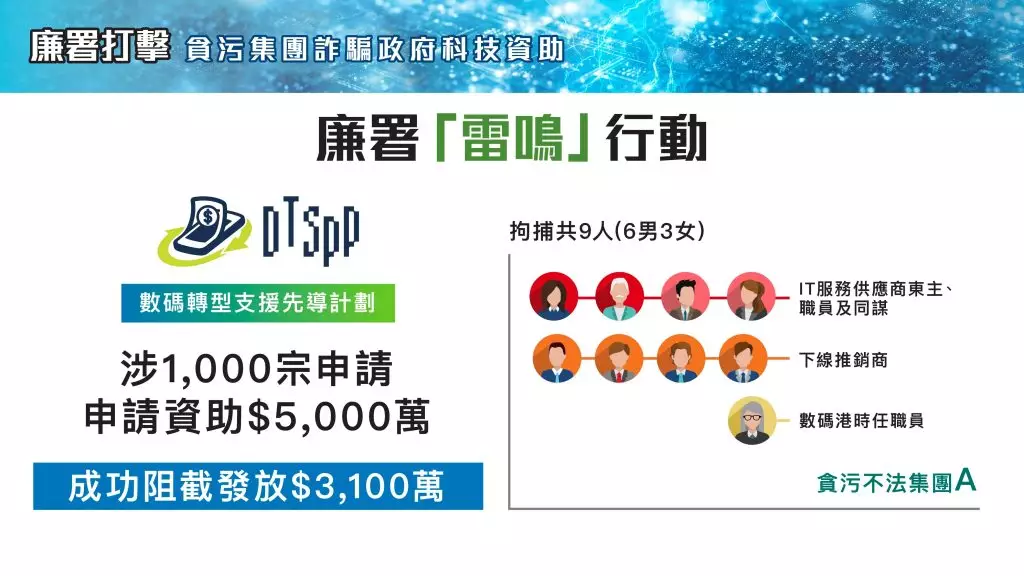 廉署針對數碼轉型支援先導計劃展開「雷鳴行動」,涉及1000宗申請,廉署說,有關不法集團申請5000萬元資助,已阻截發放3100萬元。9人在今次行動被拘捕,包括IT服務供應商東主、職員及同謀,下線推銷商及一名時任數碼港職員。