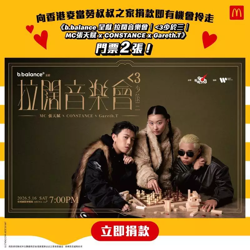 由即日起至4月20日(晚上11時59分或之前)期間,在App 或餐廳內的點餐機掃瞄 App 內之指定捐款券,成功捐款港幣$90.3 予香港麥當勞叔叔之家慈善基金,即可獲得一次抽獎機會。App 用戶可重複捐款,捐款次數越多,中獎機會越高,惟每名合資格參加者最多只能獲獎一次。每位得獎者可獲得《b.balance 呈獻 拉闊音樂會|<3 少於三|MC 張天賦 x CONSTANCE x Gareth.T》門票兩張。是次捐款活動會按特定序列選出100名得獎者,每位得獎者可獲得活動門票兩張。得獎結果將於2026年5月8日前通過登記電郵公佈。