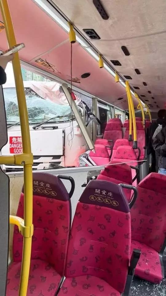 網上圖片見到,巴士右邊車身和運油車接觸,巴士車身陷入至車廂內,玻璃完全撞毁,車身和窗架變型座位移離,3條扶手桿被撞斷,窗框撞入車廂內指向關愛座後的窗邊座椅。