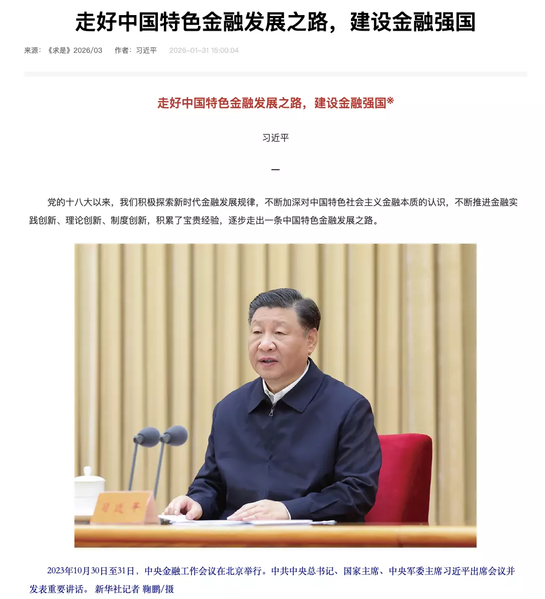 習近平《走好中國特色金融發展之路,建設金融強國》文章。 《求是》網頁截圖
