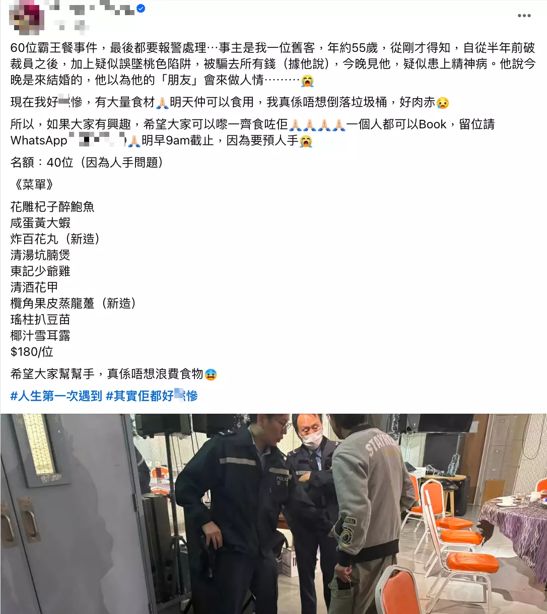 涉事私房菜日前在網上發文求助,指被一名預訂了6圍枱「婚宴餐」的舊食客「放飛機」,最終需要報警處理。店主指棄單背後的原因令人心酸,該名年約半百的舊食客身世悲慘,大約半年前突遇裁員,更疑似誤墮桃色陷阱遭呃走全部積蓄,導致如今精神狀態疑似出現異常。