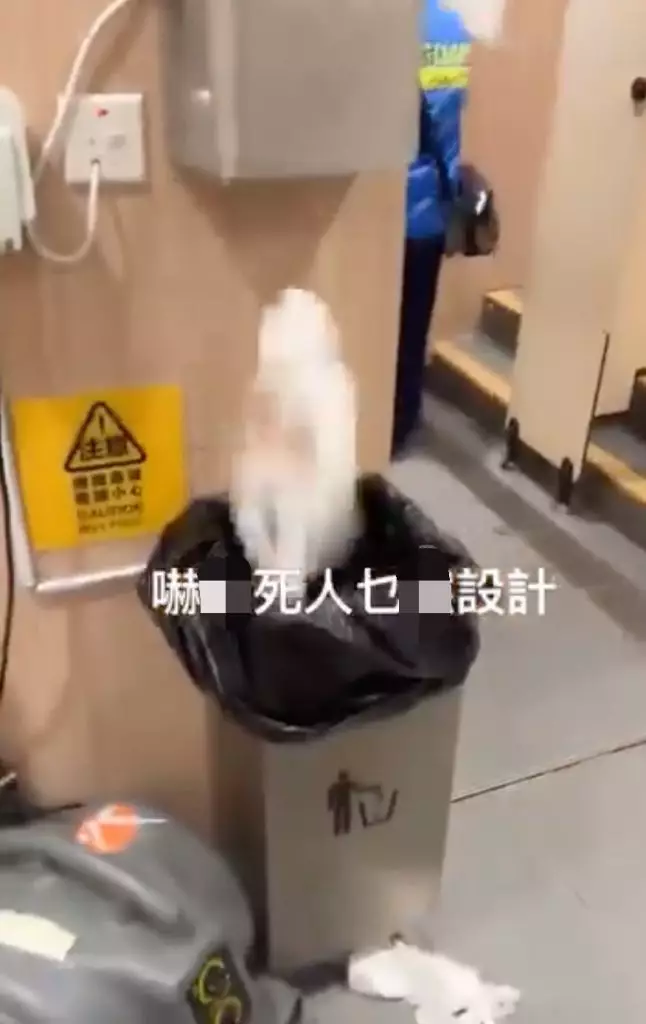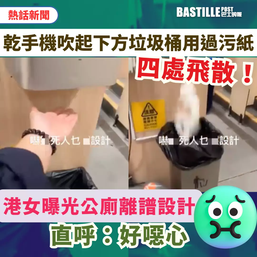 一名港女近日在本港一間公共廁所內,使用乾手機烘手時,遭遇極為荒謬的事情。她發現乾手機正下方放置一個大型垃圾桶,當機器啟動吹風時,竟將桶內使用過的廁紙吹得四處飛散,場面既誇張又令人不適。
