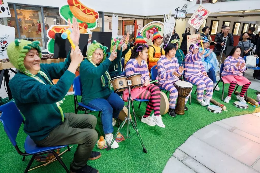 由香港展能藝術會賽馬會共融藝術工房的共融敲擊樂團帶領下,體驗火熱節奏演繹流行歌曲、兒歌、和世界音樂,輕鬆投入森巴熱情節奏。