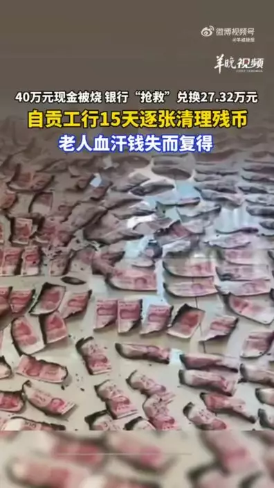 四川老夫婦將近40萬人民幣(下同)退休金存放在家中,卻因家中起火被燒毀,獲銀行職員花15日搶救兌回逾27萬(約31萬港元)。