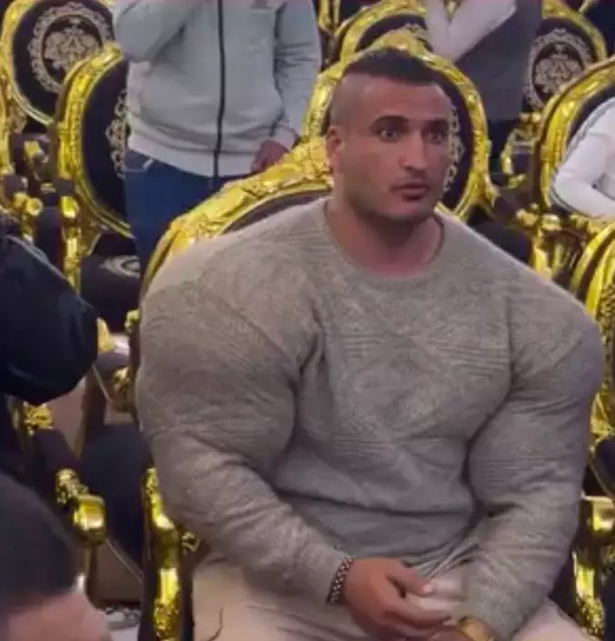 埃及一名男保鑣在當地一名歌手母親的悼念會上工作,憑誇張肌肉搶鏡,肩膀寬厚手臂爆肌宛如真人版「綠巨人浩克」。